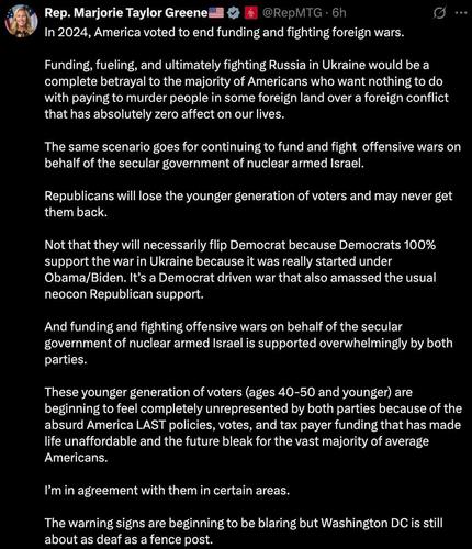 «В 2024 году Америка проголосовала за то, чтобы прекратить финансирование и ведение зарубежных войн», — написала она на своей странице в X, имея в виду победу на выборах Трампа. — «Финансирование, разжигание и, в конечном счете, ведение войны с Россией на Украине в полной мере стало бы предательством по отношению к большинству американцев, которые не хотят иметь ничего общего с оплатой убийства людей в какой-либо чужой стране из-за зарубежного конфликта, никак не влияющего на нашу жизнь».