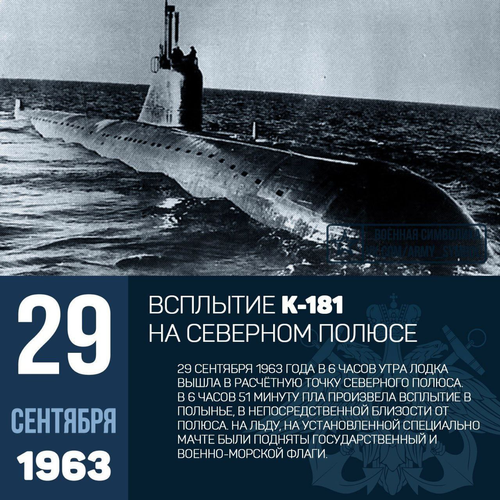 29 сентября 1963 года атомная подводная лодка К-181 впервые в мировой истории всплыла на Северном полюсе. Это важное событие в истории атомного подводного флота.